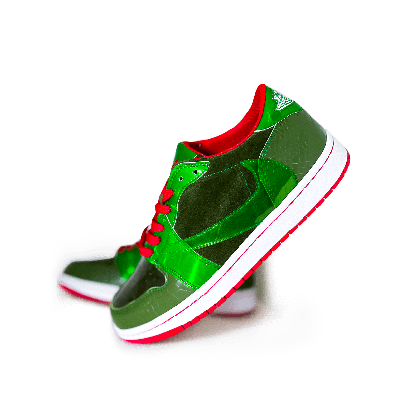 Scarpa custom su AJ 1 Low. Struttura in pregiata pelle di vitello effetto pitonato verde, arricchita da dettagli in verde metallico. Mascherina e linguetta in morbido suede verde bosco, con Reverse Swoosh in verde trasparente.